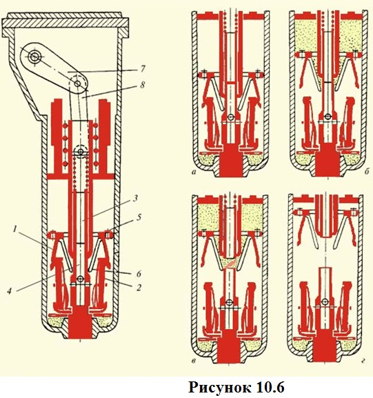 На рис. 10.6 представлены полюс автокомпрессионного выключателя и положение механизма, соответствующее различным этапам отключения.