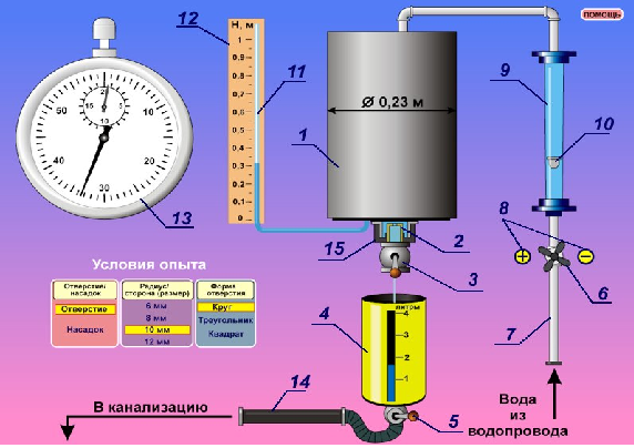 Сменный насадок (отверстие) 2 устанавливается в гнездо 15. Кран 3 перекрывает выходное отверстие насадка, а в рабочем состоянии открывает. Струя жидкости через насадок (отверстие) попадает в мерный бак 4, по его шкале определяется объем жидкости (в литрах), при перекрытии крана 5 начинается автоматический отсчет времени по хронометру 13.