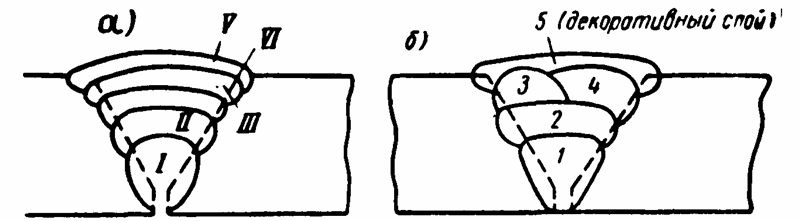 Рис. 7. Способы заполнения разделки: а - слоями ;