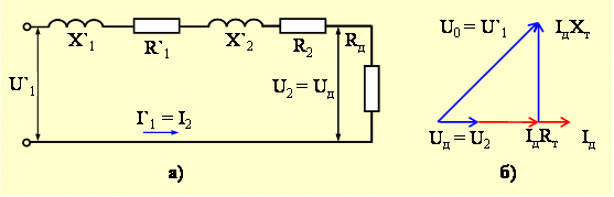 Рис. 2.4. Упрощенная эквивалентная схема замещения трансформатора (а) и векторная диаграмма для схемы при нагрузке (б)