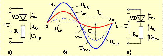 Рис. 3.2. Диаграммы изменения тока и напряжения (б); работа диода при прямом (а) и обратном (в) включении в цепи переменного тока