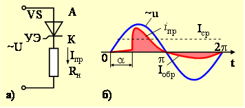 Рис. 3.4. Тиристор в цепи переменного тока (а) и диаграмма изменения тока и напряжения (б)