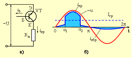 сопротивлением нагрузки Rн. При снятии тока базы в момент a2 резко снизится и прямой ток.