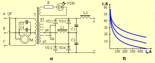 Рис. 3.17. Выпрямитель «Дуга 318М»: а – схема выпрямителя; б – внешние характеристики