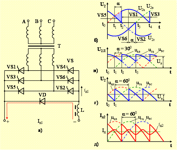 Рис. 3.19. Упрощенная схема тиристорного выпрямителя с трехфазной мостовой схемой (а) и диаграммы: б – вторичные фазные напряжения; в – вторичные линейные напряжения; г – выпрямленный прерывистый и д – сглаженный ток