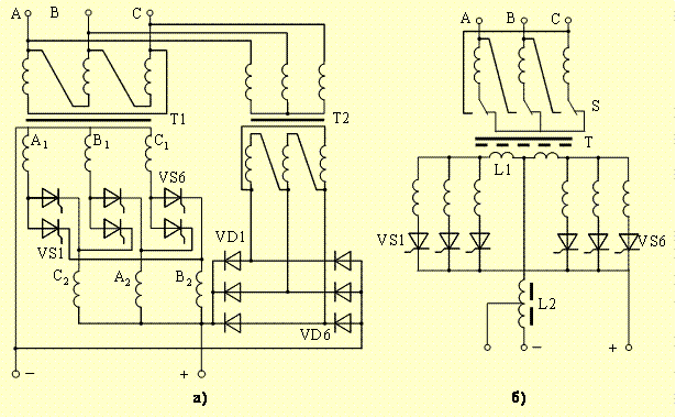 следующие схемы выпрямления: трехфазная мостовая (рис.3.19,а), шестифазная с