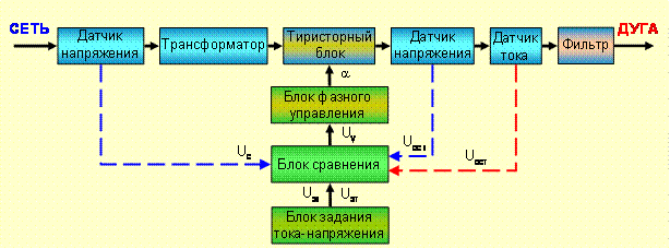 Выпрямленное сварочное напряжение Uв (сигнал Uосн) сравнивается в блоке сравнения с заданным Uзн. Их разность Uзн