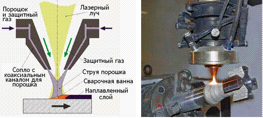 Рис.10.19. Схема лазерной наплавки с коаксиальной подачей порошка и фотография головки для лазерной наплавки