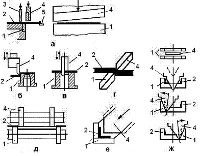 Рис.3.6. Схемы резки на ножницах различных типов: а) гильотинные ножницы; б, в) комбинированные сортовые г) двухдисковые с наклонными ножами; д) ножницы многодисковые; е) ножницы для резки уголка швеллеров и двутавров; ж) пресс-ножницы комбинированные сортовые; 1 – нижний нож; 2 – разрезаемый материал; 3 – прижим; 4 – верхний нож; 5 – упор