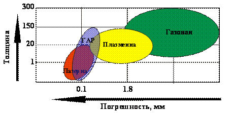 Рис.3.10. Сопоставление возможностей различных способов резки в отношении толщины материала и точности получаемых деталей