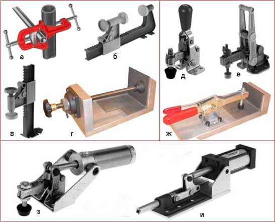 Винтовые прижимы (а, б, в, г); ручные рычажные (д, е, ж); прижимы и рычажные