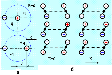 Рис.1.26. Виды поляризации диэлектрика в электрическом поле: а – поляризация атомов; б – ориентационная поляризация