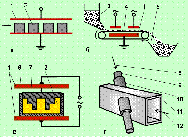 Рис. 1.30. Схемы технологических установок: 1 – обкладки конденсаторов; 2 – изделие; 3 – бункер; 4 – материал; 5 – контейнер; 6 – плита, передающая усилие; 7 – пуансон; 8 – поток жидкости; 9 – трубка стеклянная; 10 – трубка резиновая; 11 – волновод; 12 – поток излучения