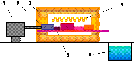 Рис.1.7. Схема толкательной печи: 1 – толкатель с приводным механизмом; 2 – нагреваемые изделия; 3 – теплоизолированный корпус; 4 – нагревательные элементы; 5 – подина печи: 6 – закалочная ванна