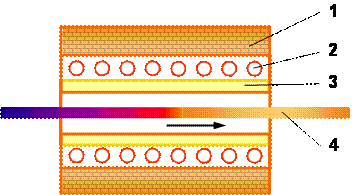 Рис. 1.8. Протяжная электропечь: 1 – теплоизолирующий корпус; 2 – нагревательный элемент; 3 – муфель; 4 – нагреваемые изделия