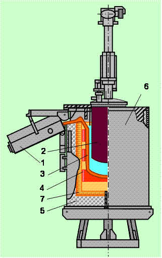 Рис.1.9. Тигельная ЭПС: 1 – желоб; 2 – дозатор; 3 – тигель; 4 – нагревательный элемент; 5 – футеровка (корпус); 6 – кожух; 7 – теплоизолятор