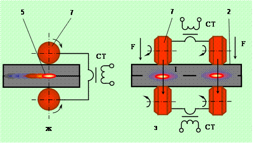 преимущественно при помощи двух вращающихся дисковых электродов (роликов) 7,
