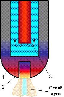При работе на токах, когда пятно дуги занимает 75-85 % площади активной вставки, образующаяся лунка окружена пленкой соединений, предотвращающей контакт дуги с медной втулкой. При переходе дуги на медную втулку вследствие роста тока дуги втулка отжигается, что приводит к нарушению теплового контакта в системе оболочка (втулка) – активная вставка и электрод выходит из строя. Допустимая плотность тока на цирконии составляет 50-60 А/мм2.