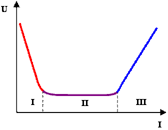 Причиной падения характеристики на участке I является снижение сопротивления дуги при увеличении