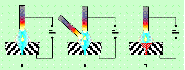 Рис.2.11. Сварка дугой прямого действия плавящимся электродом на постоянном или переменном токе: а – без дополнительного присадочного металла; б – с дополнительным присадочным металлом, подаваемым в зону дуги в процессе сварке; в – сварка по металлической крошке
