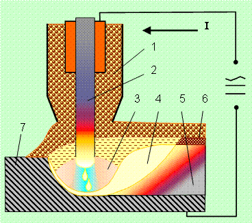 Дуга горит между электродом 2 и основным металлом 7 в