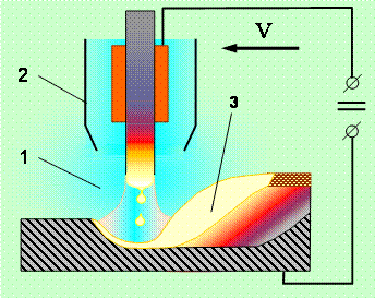 подается специальный флюс или защитный газ. В процессе горения дуги вместе с