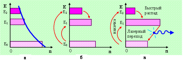 необходимо, чтобы число атомов на верхнем уровне E1 было бы больше числа атомов на нижнем уровне Е0. В