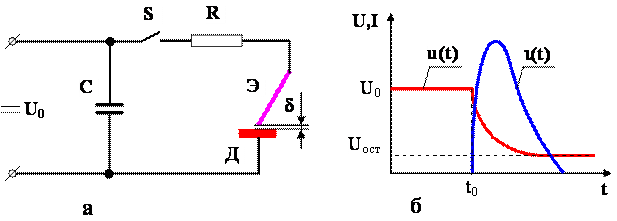 Рис 4.7. Принципиальная схема RC-генератора (а) и характера изменения напряжения и тока при искровом разряде (б)