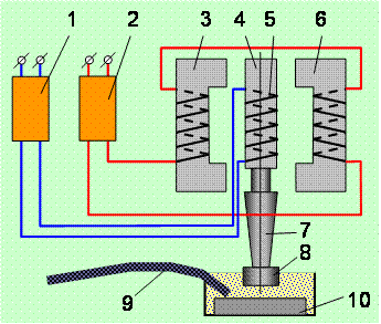 электромагнитов 3 и 6, питаемых от источника постоянного тока 2, возникает