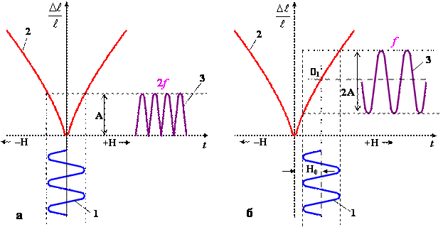 Рис.6.2. Характер работы магнитострикционного преобразователя: а – без подмагничивания преобразователя; б – с подмагничиванием преобразователя; 1 – кривая намагничивания от высокочастотного преобразователя; 2 – кривая магнитострикционной деформации сердечника; 3 – частота и амплитуда изменения деформации сердечника магнитострикционного преобразователя; Н – напряженность постоянного магнитного поля; Н0 – постоянная смещения напряженности магнитного поля