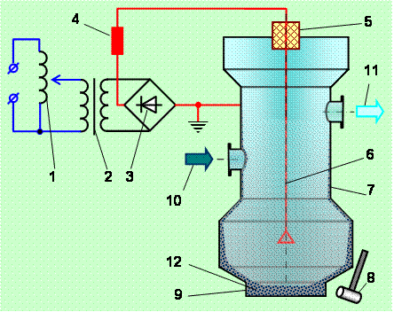 Рис. 7.3. Принципиальная схема электрофильтра: 1 – регулирующий автотрансформатор; 2 – повышающий трансформатор; 3 – высоковольтный выпрямитель; 4 – кабель с ограничительным сопротивлением; 5 – изолирующий ввод;6 – коронирующий электрод; 7 – осадительный электрод (корпус); 8 – механизм встряхивания; 9 – бункер, 10 – газ запыленный, 11 – газ очищенный, 12 – осадок