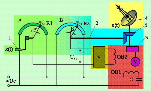 усилителем У и вызывает ток в обмотке ОВ1 электродвигателя М, приводящий во
