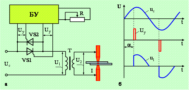 точечной сварки. Графики рис.2.3,б поясняют работу тиристорного контактора.