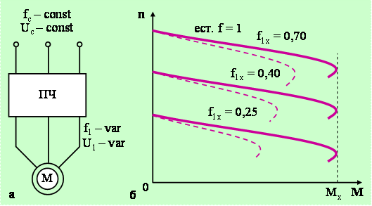 от преобразователя частоты; б – механические характеристики двигателя при